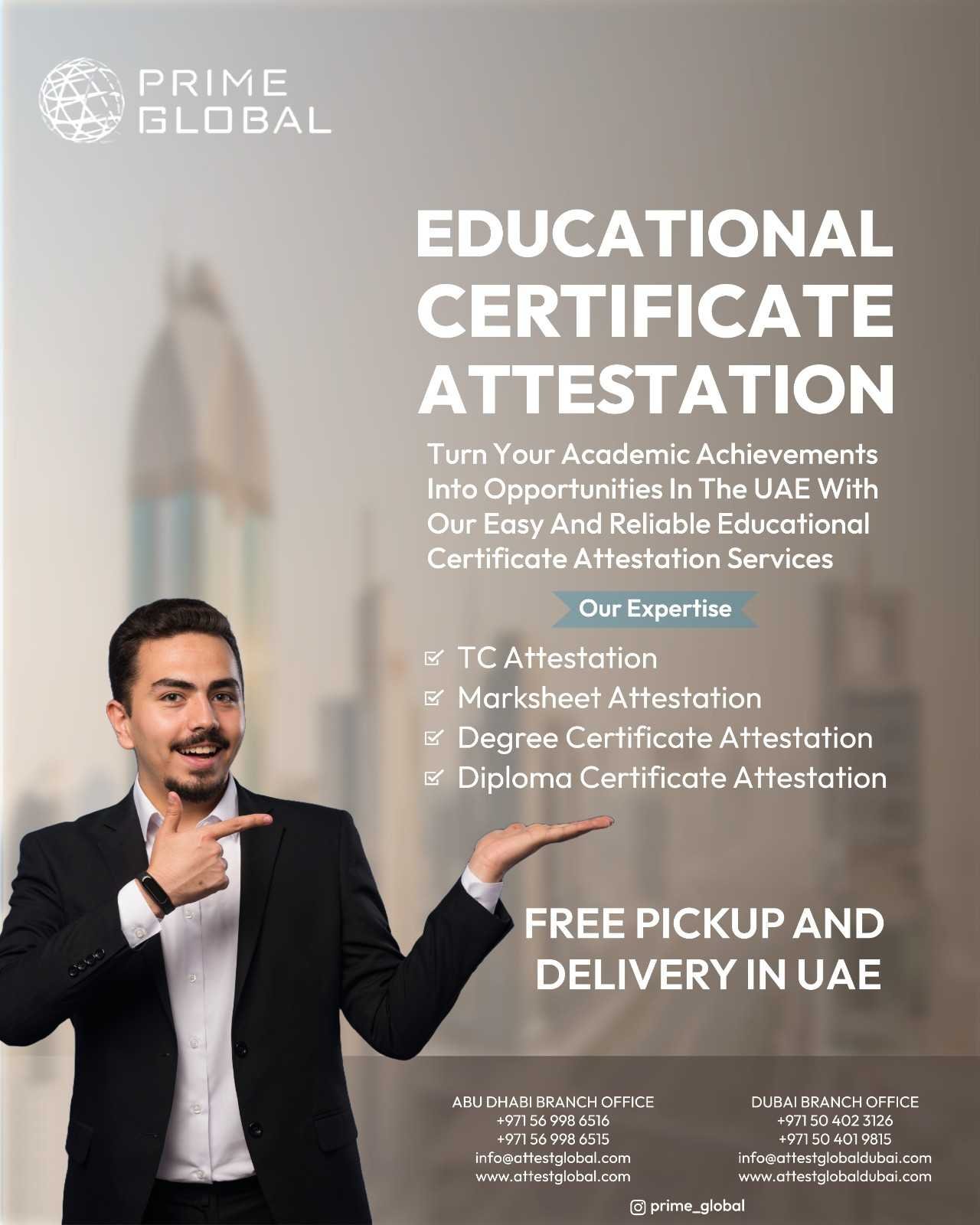 Prime Global Attestation provides all types of certificate attestation services in the UAE. We do attestation for Degree, Diploma, Marriage, Birth, Mofa, commercial, TC and more with 100+ countries attestation at the affordable prices.